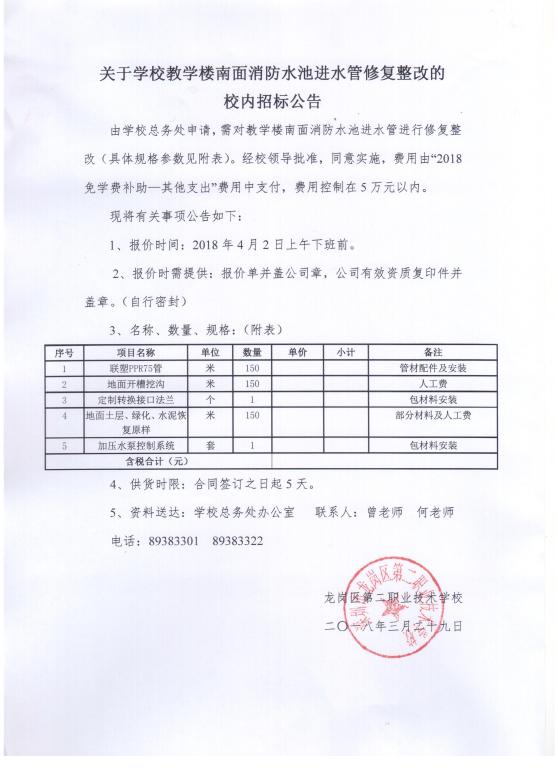关于学校教学楼南面消防水池进水管修复整改的校内招标公告